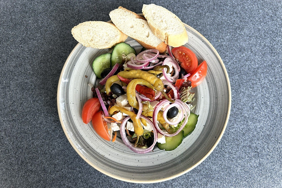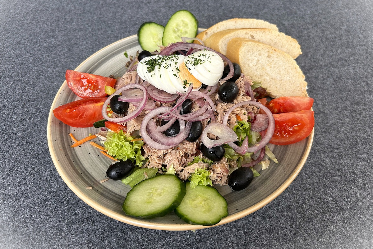Salat mit geräucherten Entenbruststreifen, Himbeerdressing und Baguette