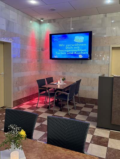 Der Screen befindet sich im Gastronomiebereich im Foyer der Weser-Therme und ist 1,50 x 0,90 m groß. Die Gäste, die auf das Lösen des Tickets warten, könnten während der Wartezeit Ihre Werbung sehen. Auch nehmen die Gäste, die im Gastronomiebereich speisen, sicherlich, dass ein oder andere Angebot unserer Partner wahr. Der Screen läuft zu unseren Öffnungszeiten von 9 – 22/23 Uhr.